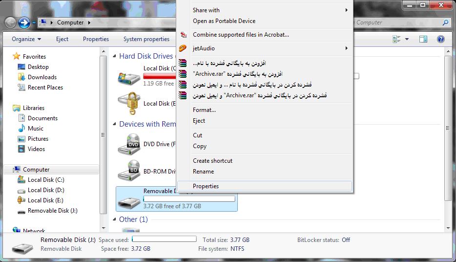 از جمله نکاتی که باید بدانیم این است که ویروسها باید ابتدا در ROOT (ریشه) یک حافظه جانبی منتقل شوند تا از طریق آن بتوانند سیستمهای میزبان را آلوده کنند.بنابراین میبایست از انتقال هرگونه دیتا به روت فلش مموری جلوگیری کنیم. بنابراین ابتدا نوع پارتیشن بندی فلش مموری رااز FAT به NTFS تبدیل میکنیم.(تصویر 1)سپس یک پوشه داخل فلش مموری ساخته و دسترسی خواندن و نوشتن را میدهیم و یک میانبر هم از آن در کنارش بسازیم.(تصویر2)